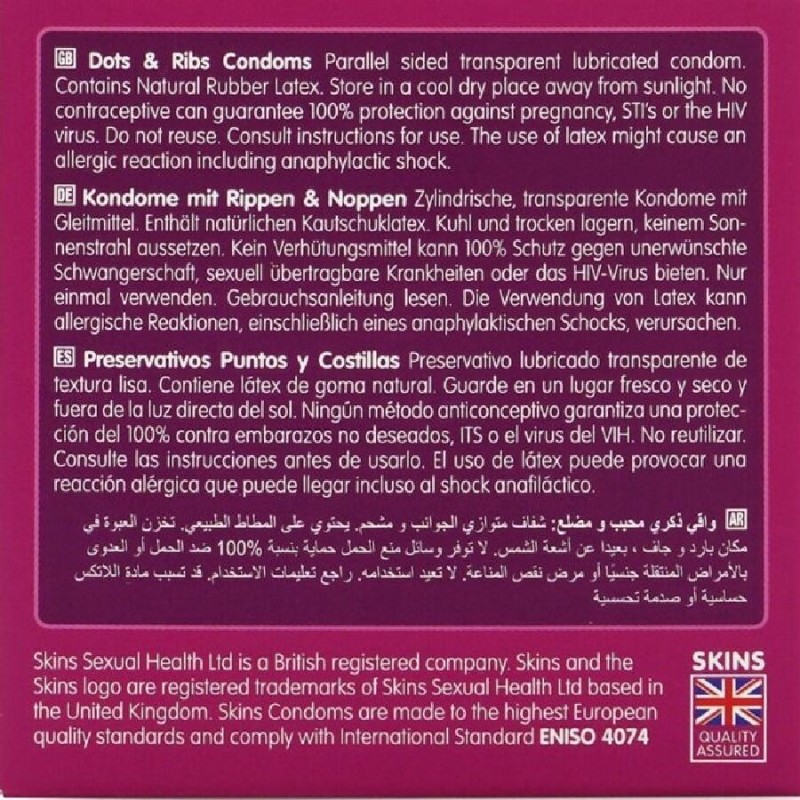 Skins has combined strategically placed raised ribs to deliver enhanced pleasure to the wearer along with delightfully delicate dots to deliver enhanced sensation to the partner, working in harmony to maximize pleasure and enjoyment for both partners during those intimate moments. Skins Dots Ribs condoms are made from premium natural latex for a sheer, enhanced, and durable feel. So thin they feel like a second skin! Never go inside without a Skin!