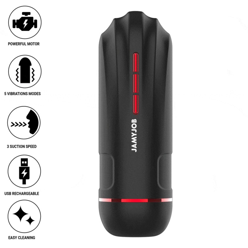 The JAMYJOB MEGABITE automatic mouth-shaped male masturbator is an innovative and elegant device designed to provide a high-quality, stimulating and pleasurable experience. Featuring a black and red design and red accents, this masturbator combines aesthetics and functionality in a single product.