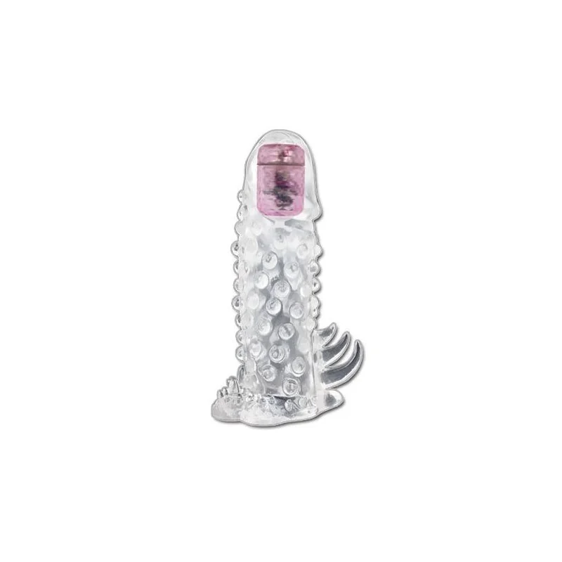 Increase your size and performance for intense bedroom fun with this vibrating penis sleeve. This sleeve is designed to fit around your erection, giving your erection more length and girth to play with, plush textures, an extra inch of length, and a vibrating motor right at the tip.